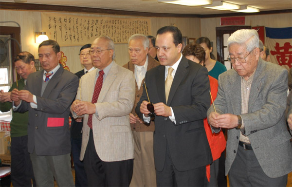 当天中午时分,黄氏宗亲会主席黄兆仪、黄劲秀带领黄氏宗亲族人,对12区区长卡迪纳斯的到来表示热烈欢迎。在抵达黄氏宗亲会会所后,卡迪纳斯区长入乡随俗,与黄氏宗长们一起,聆听黄景雄元老恭读“黄氏先祖遗训”,向黄氏先祖神像鞠躬行礼,上香敬酒,体现卡迪纳斯区长对中国民俗传统的尊重。