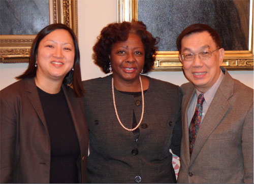 2010年11月,马静仪(左)与华埠更好团结联盟主席陈增华(右)前往伊州首府,推动州议会选区重划,与伊州参议员Mattie Hunter (中)合影