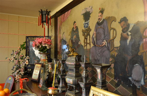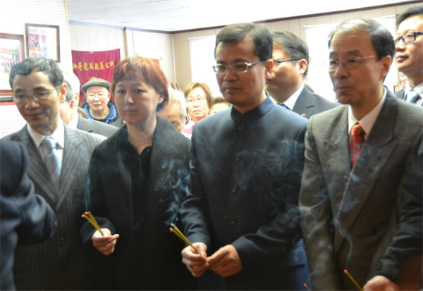 赵卫平总领事携夫人龚玫,向先祖神像敬香