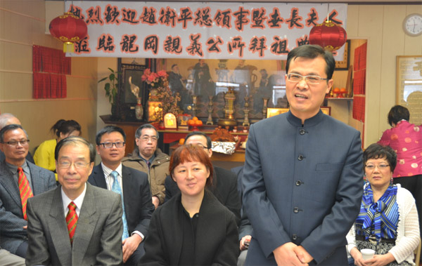 芝加哥侨学网报道】清明节之际,芝城龙冈亲义公所刘、关、张、赵四姓宗亲,4月7日隆重举办“龙冈日”拜祭先祖活动。中国驻芝加哥总领事馆总领事赵卫平,特别参加了拜祭典礼,并强调对祖先的尊崇是中华民族的悠久传统,是海外炎黄子孙不忘根的体现,也是中华文明世代相传的重要原因。