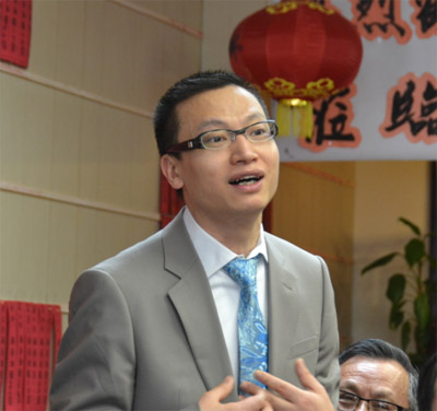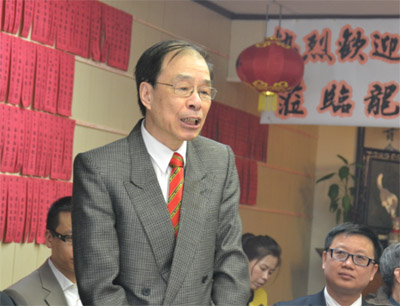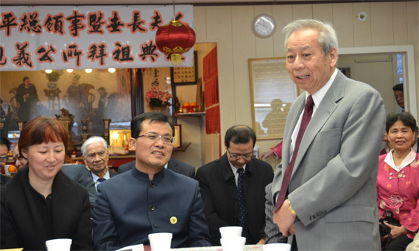 拜祭典礼之后,宾主入座,谈笑风生。张杰英主席代表芝城龙冈公所职员,对赵卫平总领事、副总领事王永一行的带来表示热烈欢迎。张杰英介绍了龙冈宗亲每年清明之际祭拜先祖的传统,并强调龙冈公所历史源远流长,四姓宗亲人才辈出,加州联邦议员赵美心,前劳工部长赵小兰均是龙冈宗亲的骄傲,而赵卫平总领事莅临拜祖活动,更让龙冈宗亲倍感自豪。张杰英强调龙冈公所一向爱国爱乡,与总领事馆保持密切联系。