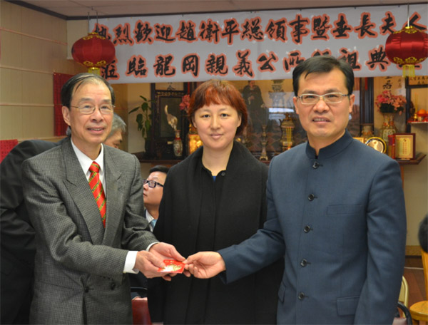 认祖归宗,赵卫平总领事(右一)向龙冈公所捐助香油红包,左一为张杰英主席
