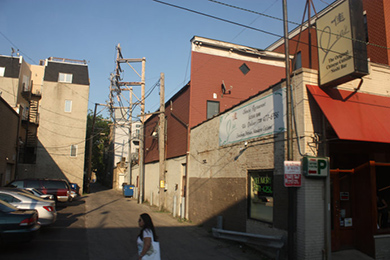只是这条街上的酒吧出奇地多,路边的人行道上也摆着很多桌椅,汽车随意地停放在马路边儿……