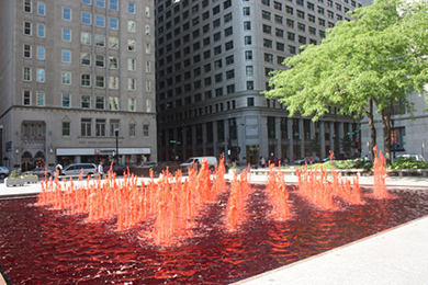 雕塑广场举行了声势浩大的庆祝活动,而芝加哥市也特地把广场上的喷泉“染”成了