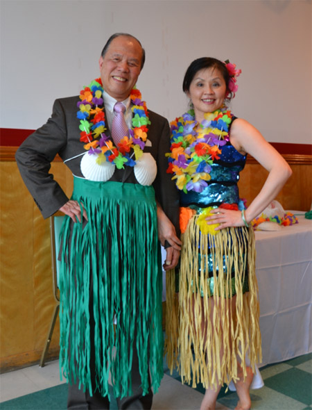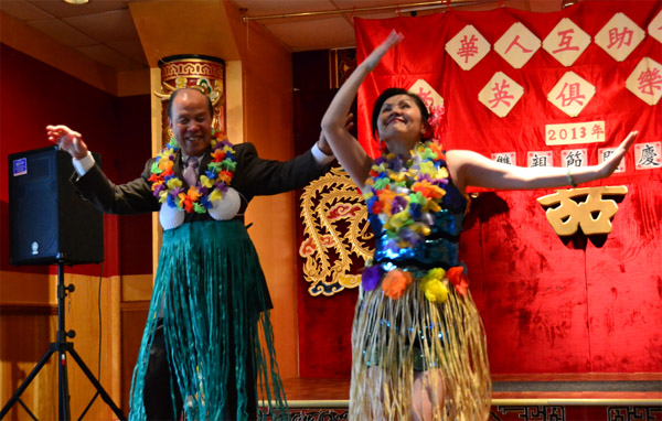 耆英俱乐部负责人黄仲山(左)与彭惠贞演绎夏威夷风情