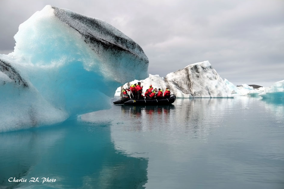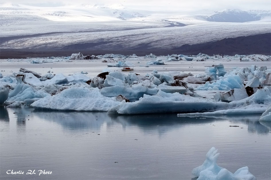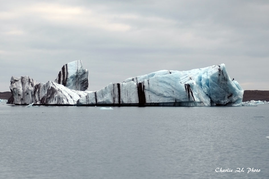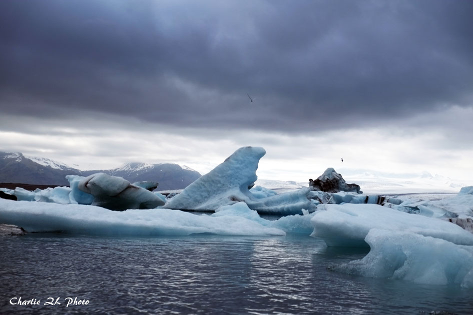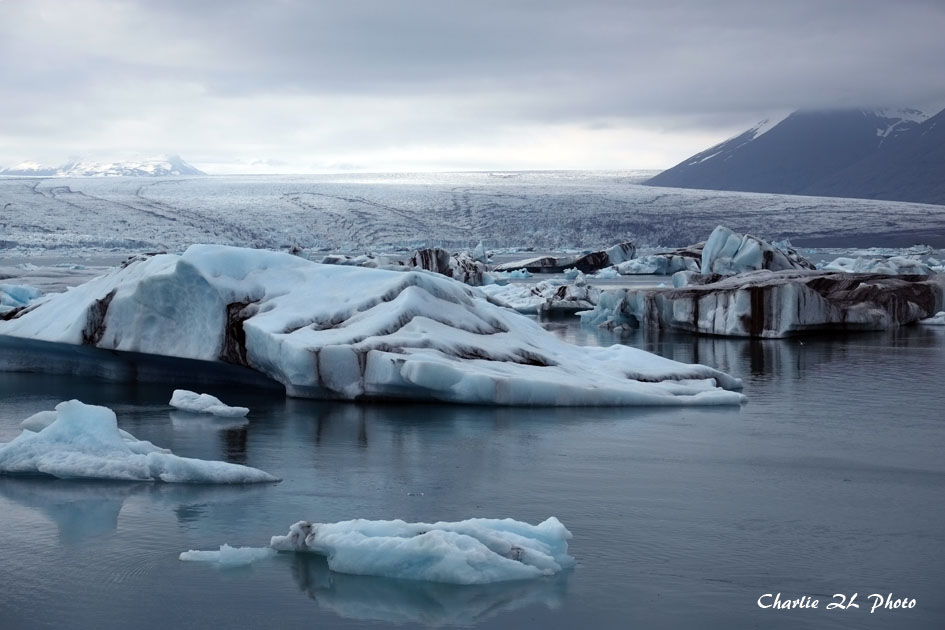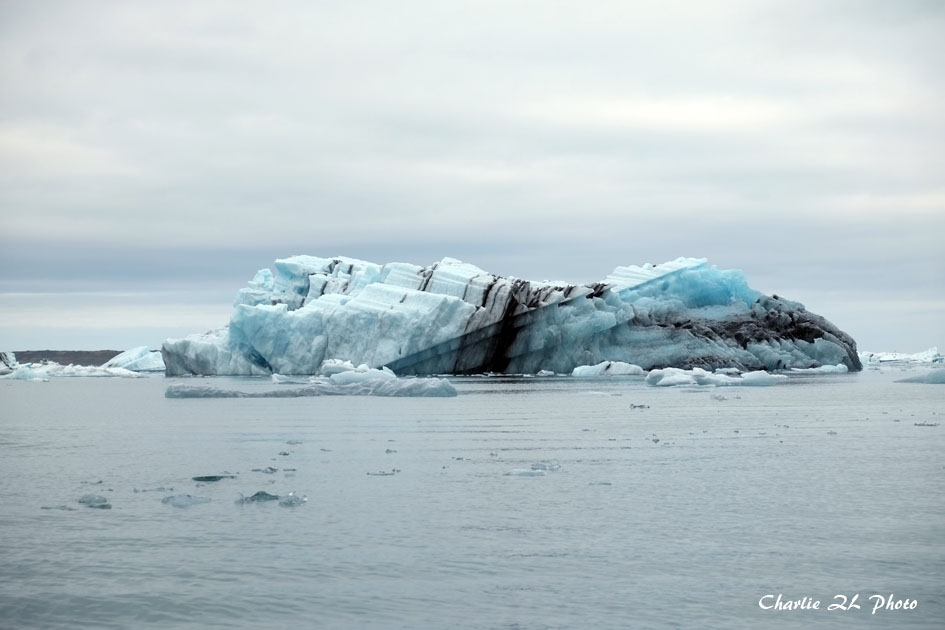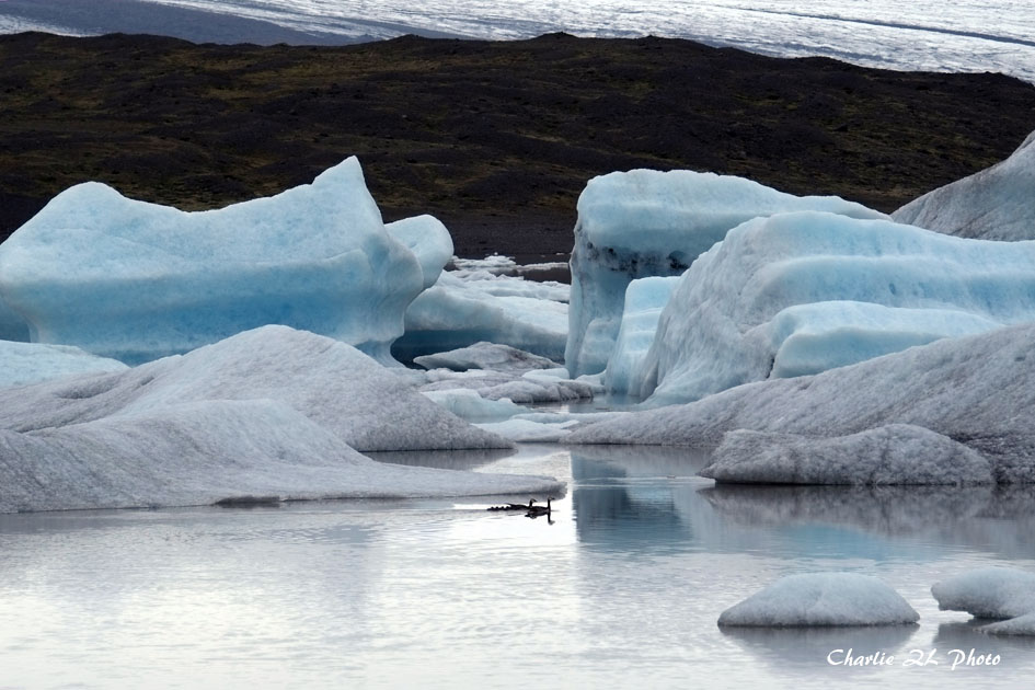 冰岛。冰川规模仅次于南极洲和格陵兰岛。蓝色的是刚脱离冰川且冰的密度较大的新冰,白色的为已流失冰的密度并在快速融化的老冰。黑色为火山灰,是冰岛独有的景色。
